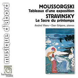 MOUSSORGSKI : Tableaux d'une exposition Voici deux œuvres dont la température est à la mesure de la ferveur révolutionnaire russe, deux œuvres qui cassent les règles en allant bien au-delà des paramètres musicaux précédemment connus. Cet enregistrement en dit long sur la capacité du pianiste roumain Andreï Vieru à recréer la partition de Moussorgski dans toute sa richesse et sa gloire innovatrice� Les Tableaux d'une exposition : l'impact global est à la fois sensible et manifeste. Dans "le Vieux Château", il y a un sens impressionnant de l'étonnement, comme si l'on se ressouvenait les "batailles perdues et gagnées" et Vieru est vraiment sépulcral et mystérieux dans "Catacombae". Le Sacre du Printemps de Stravinsky est présenté dans la version à deux pianos du compositeur et ici Vieru est rejoint par son professeur et compatriote Dan Grigore. Leur jeu, depuis l'appel primal à l'attention jusqu'à l'hyperactivité qui s'ensuit est d'une puissance et d'un charisme magnifiques. Les deux pianistes s'approprient l'énorme spectre de la technique et de l'imagination de Stravinsky, avec un sens approprié de l'aplomb et une attention scrupuleuse portée aux détails.
